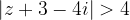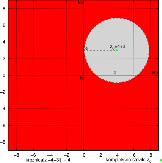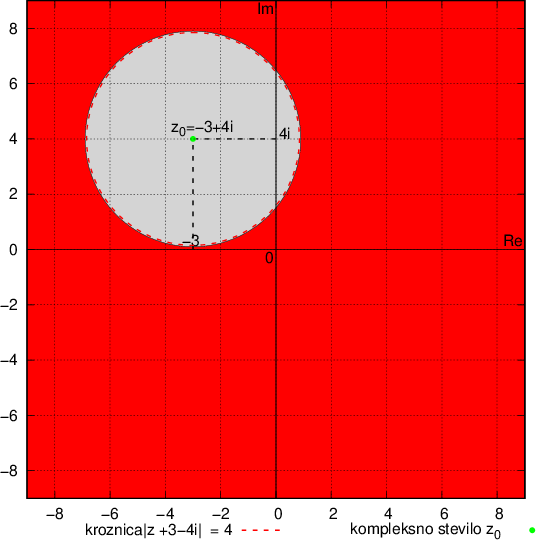 V našem primeru gre zaradi znaka > za zunanjost krožnice s središčem v in polmerom r = 4 (na sliki označeno rdeče), brez krožnice (krožnica zato narisana črtkano).