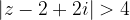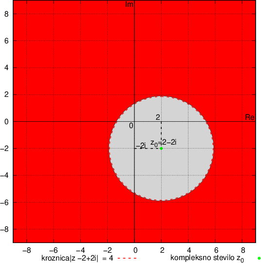 V našem primeru gre zaradi znaka > za zunanjost krožnice s središčem v in polmerom r = 4 (na sliki označeno rdeče), brez krožnice (krožnica zato narisana črtkano).