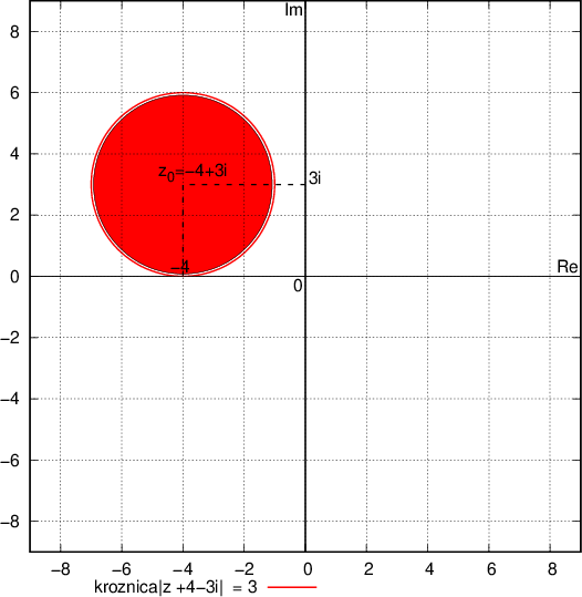 V našem primeru (znak ) gre za notranjost kroga s središčem v in polmerom r = 3 vključno s krožnico (krožnica zato narisana s polno črto):