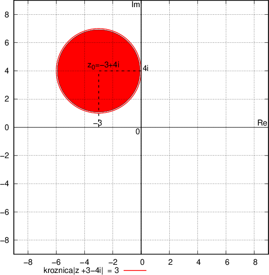 V našem primeru (znak ) gre za notranjost kroga s središčem v in polmerom r = 3 vključno s krožnico (krožnica zato narisana s polno črto):