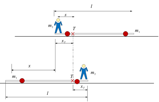 Ker prvotno težišče miruje, se po premiku moža težišče ne premakne; pomeni, da se voziček premakne v nasprotni smeri kot se giblje mož .