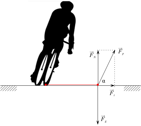 Na opazovani sistem delujeta Zemlja s silo in podlaga s silo Silo razstavimo na silo s katero podlaga deluje pravokotno na kolo in silo trenja (glejte sliko).