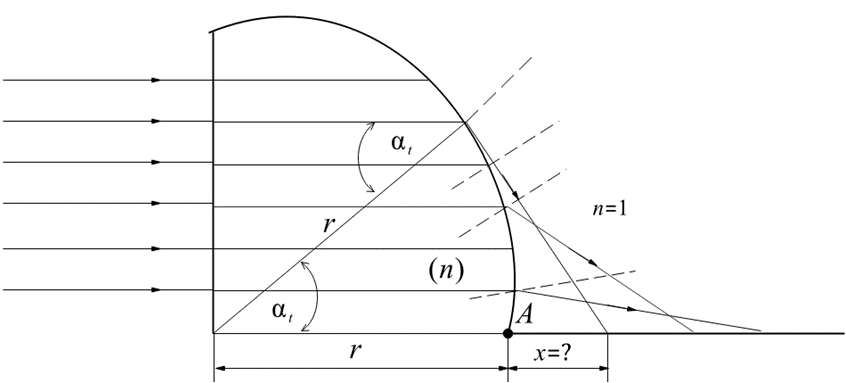 Na vodoravni podlagi je polovica polkrožne steklene plošče, ki ima lomni količnik in polmer je (glejte sliko).