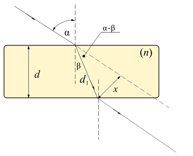 Izračunajte premik svetlobnega žarka pri izhodu svetlobnega žarka iz plošče