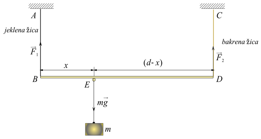 Na vzporednih žicah enakih dolžin in prečnih presekov je palica na kateri visi utež z maso